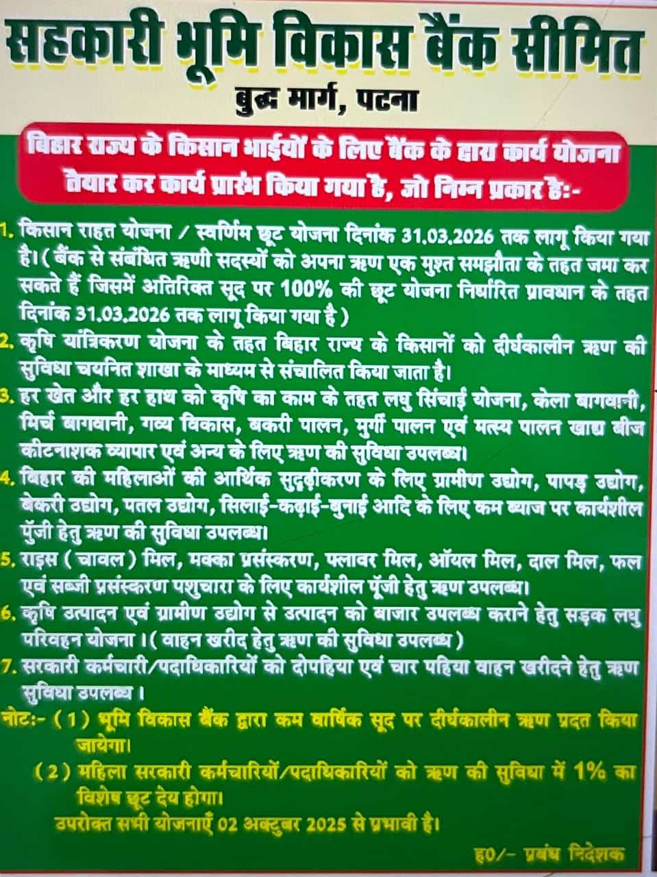 1. किसान राहत योजना / स्वर्णिम छूट योजना दिनांक 31.03.2026 तक लागू किया गया है. (बैंक से संबंधित ऋणी सदस्यों को अपना ऋण एक मुश्त समझौता के तहत जमा कर सकते हैं जिसमें अतिरिक्त सूद पर 100% की छूट योजना निर्धारित प्रावधान के तहत दिनांक 31.03.2026 तक लागू किया गया है).