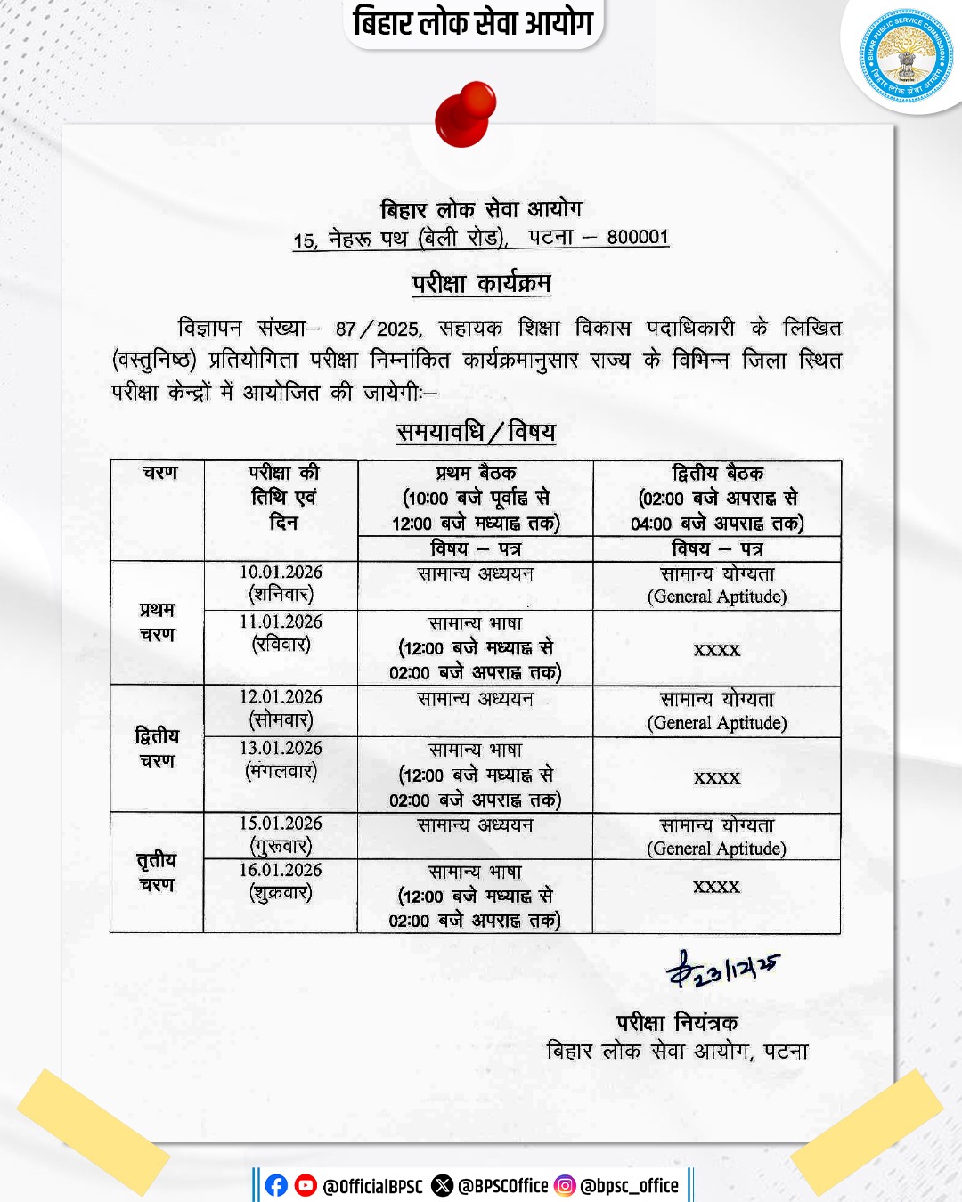 बिहार पब्लिक सर्विस कमीशन द्वारा जारी नई शेड्यूल के अनुसार उक्त परीक्षा तीन चरणों में क्रमशः दिनांक- 10 एवं 11.01.2026, 12 एवं 13.01.2026 तथा 15 एवं 16.01.2026 को तिन चरणों में आयोजित होगा.