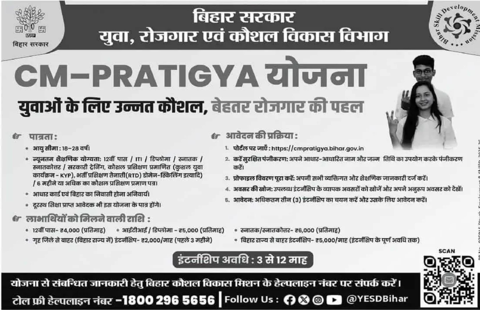 आपकी जानकारी के लिए बता दें यह योजना सरकारी विभागों, पीएसयू, एमएसएमई, प्राइवेट कंपनियों और बड़े उद्योगों में इंटर्नशिप का मौका देती है. CM Pratigya Yojana का मुख्य लक्ष्य है कि बिहार के ग्रामीण, पिछड़े और वंचित युवा मुख्यधारा में जुड़ें, आत्मविश्वास बढ़े और वे स्वरोजगार या नौकरी के लिए तैयार हों.