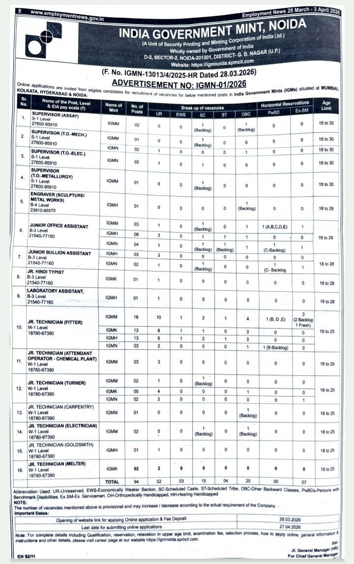 India Government Mint – IGM, नोएडा द्वारा विज्ञापन संख्या IGMN-01/2026 के तहत टोटल 94 रिक्त पदों पर भर्ती हेतु आवेदन फॉर्म आमंत्रित किया है. और कुल 94 पदों को दो मुख्य श्रेणियों में बांटा गया है – सुपरवाइजरी एवं टेक्निकल पद और नॉन-टेक्निकल/असिस्टेंट पद. पूरा विवरण इस प्रकार है:-