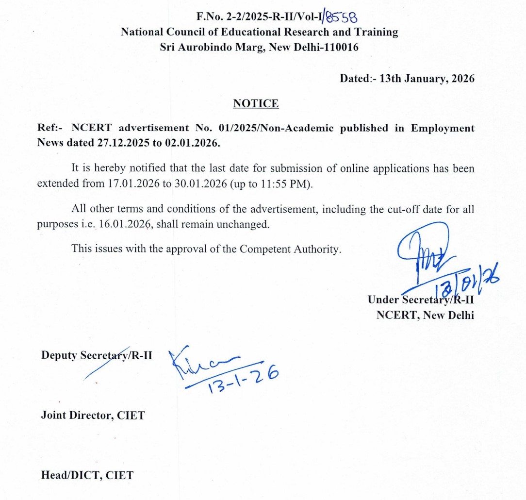 Latest News:- NCERT Various Non-Academic (Non-Teaching) Posts (Group A, B & C) Recruitment 2025-26 के ऑनलाइन आवेदन की अंतिम तिथि 16 जनवरी 2026 से बढ़ाकर 30 जनवरी 2026 तक कर दिया गया है.