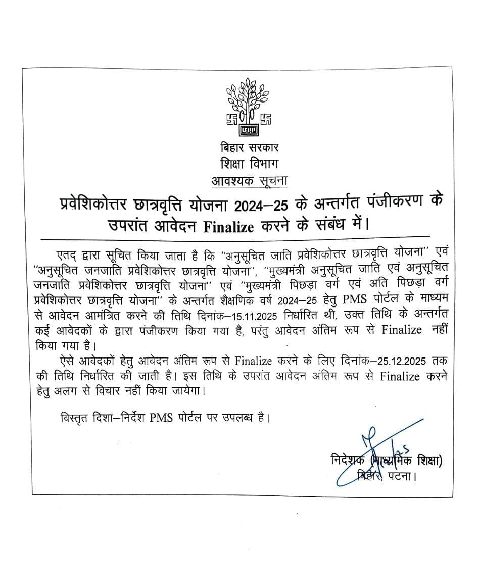 एतद् द्वारा सूचित किया जाता है कि “अनुसूचित जाति प्रवेशिकोत्तर छात्रवृत्ति योजना” एवं “अनुसूचित जनजाति प्रवेशिकोत्तर छात्रवृत्ति योजना”, “मुख्यमंत्री अनुसूचित जाति एवं अनुसूचित जनजाति प्रवेशिकोत्तर छात्रवृत्ति योजना” एवं “मुख्यमंत्री पिछड़ा वर्ग एवं अति पिछड़ा वर्ग प्रवेशिकोत्तर छात्रवृत्ति योजना” के अन्तर्गत शैक्षणिक वर्ष 2024-25 हेतु पीएमएस पोर्टल के माध्यम से आवेदन आमंत्रित करने की तिथि दिनांक-15.11.2025 निर्धारित थी, उक्त तिथि के अन्तर्गत कई आवेदकों के द्वारा पंजीकरण किया गया है, परंतु आवेदन अंतिम रूप से फाइनलाइज नहीं किया गया है।