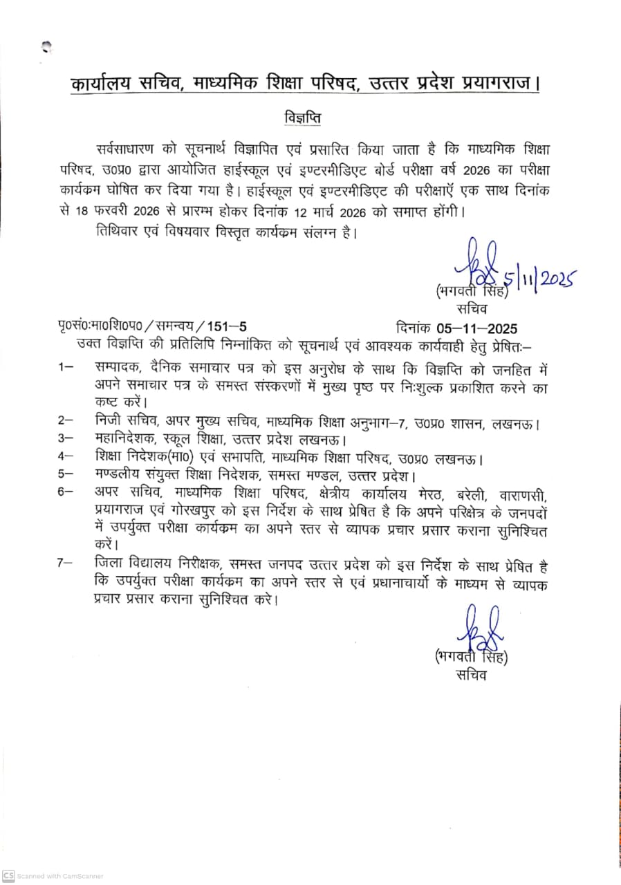 यदि आप उत्तर प्रदेश माध्यमिक शिक्षा परिषद (UPMSP) के कक्षा 10वीं (हाईस्कूल) के छात्र-छात्रा हैं, तो आप यहाँ से UP Board Class 10th Date Sheet & Time Table 2026 चेक कर सकते हैं, साथ हीं पीडीएफ भी डाउनलोड कर सकते हैं. –
